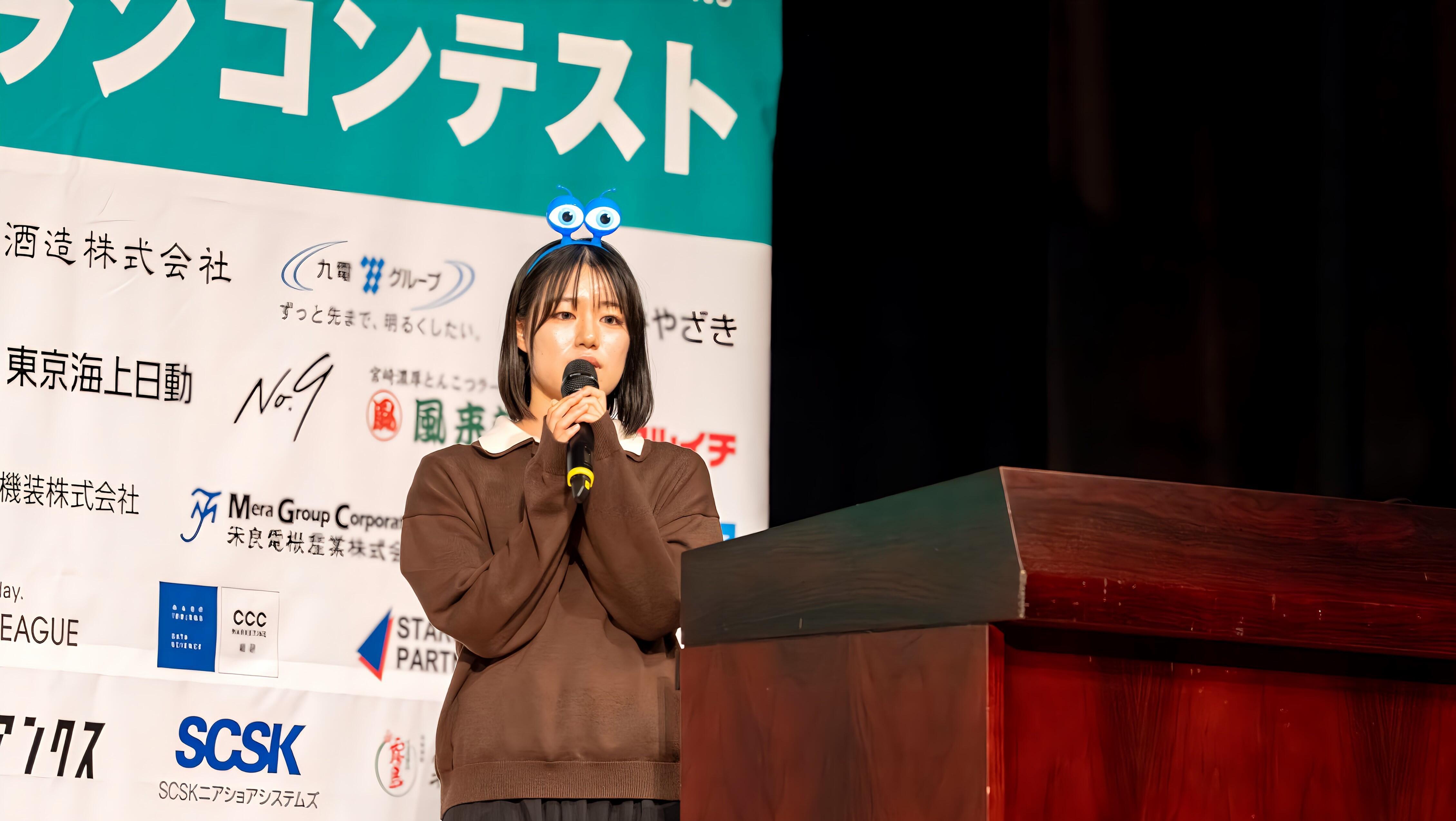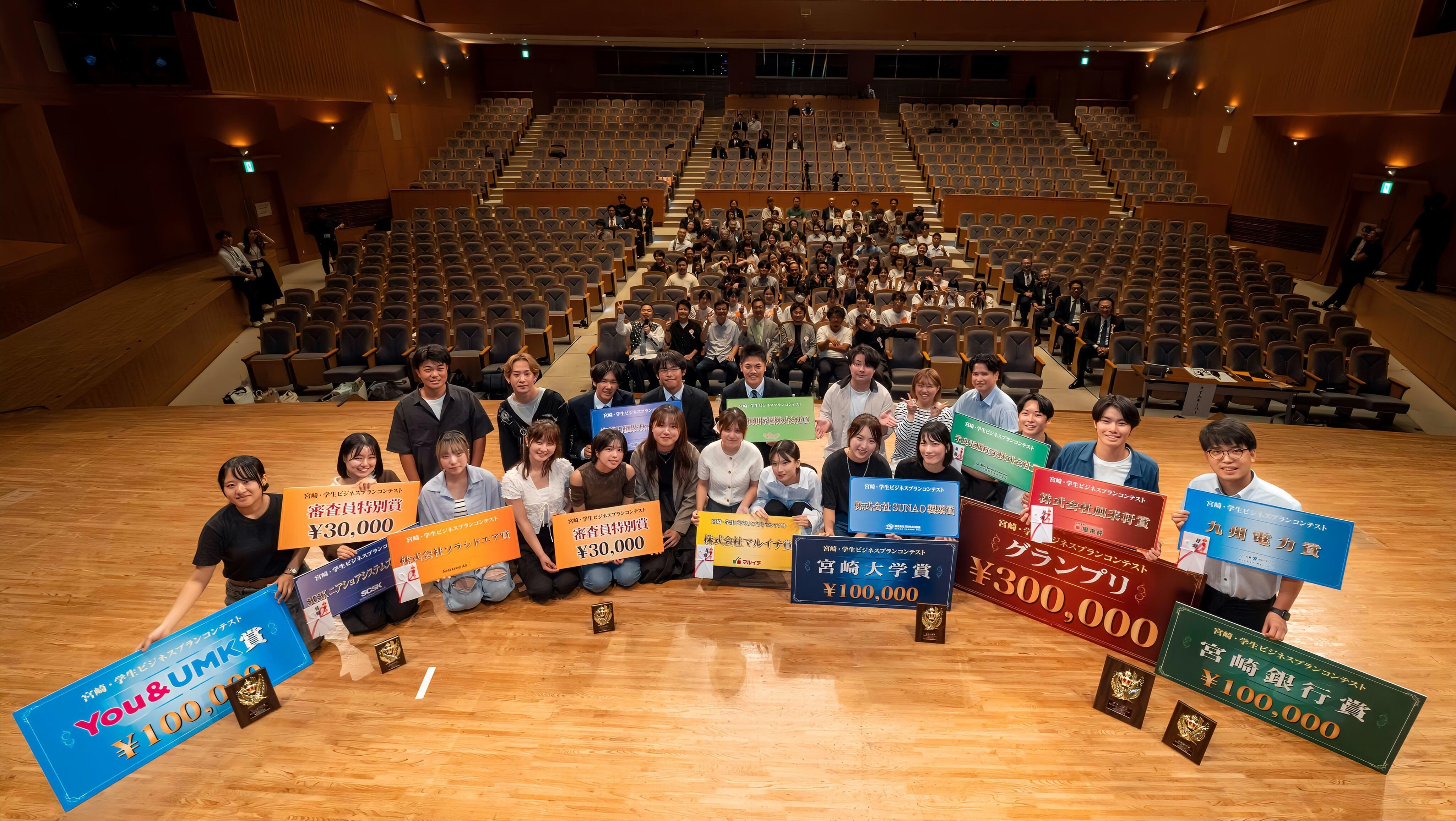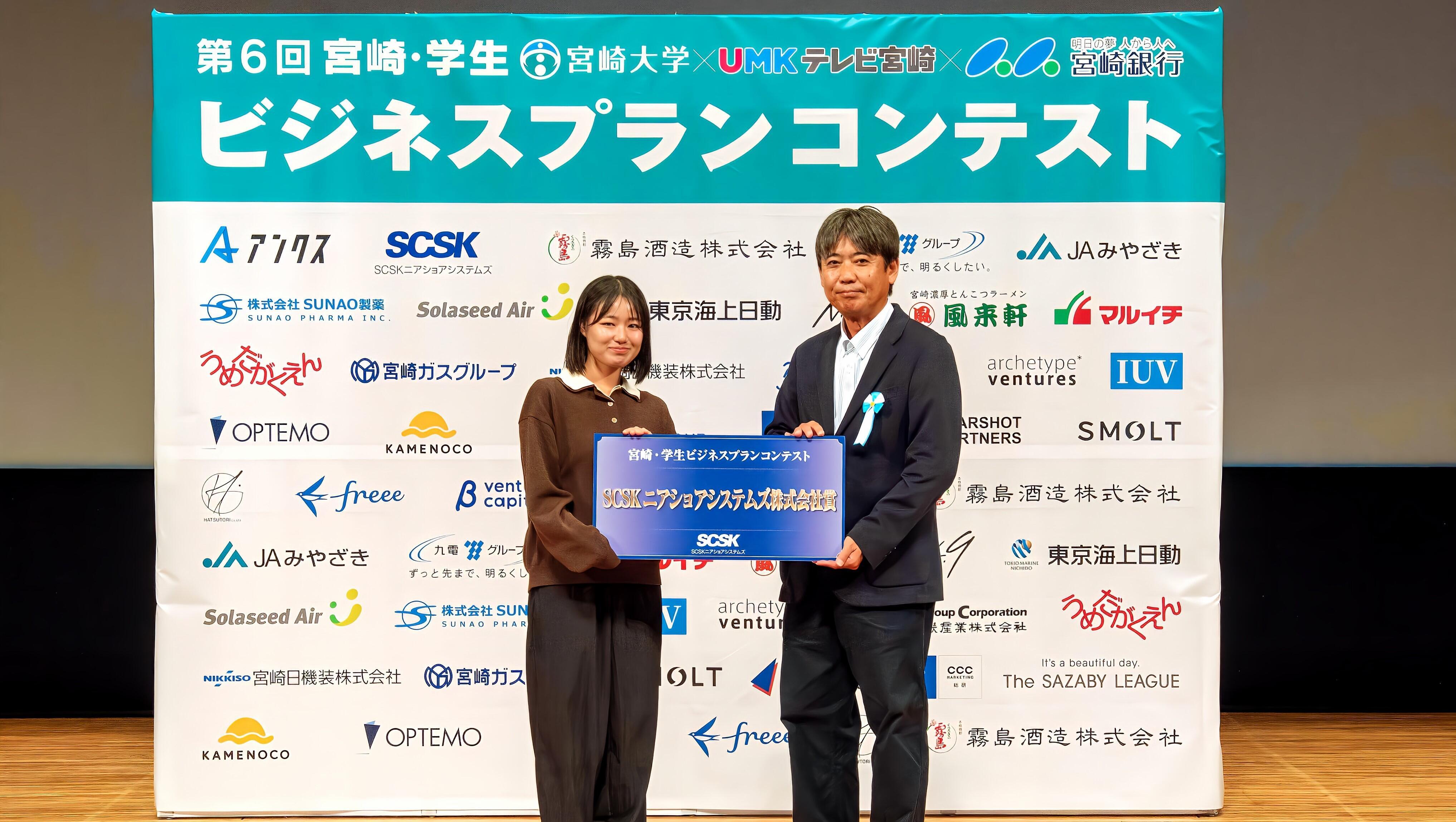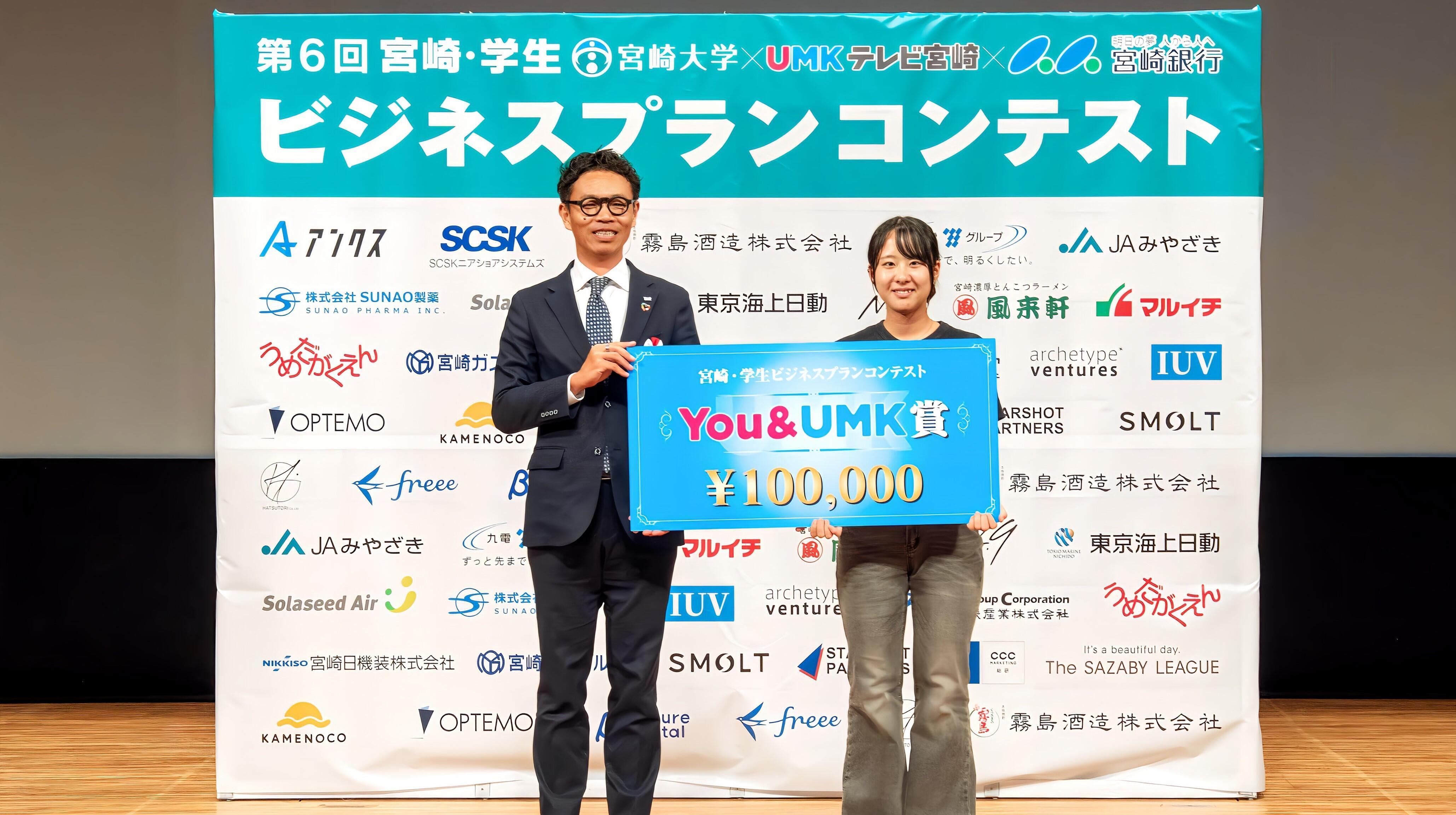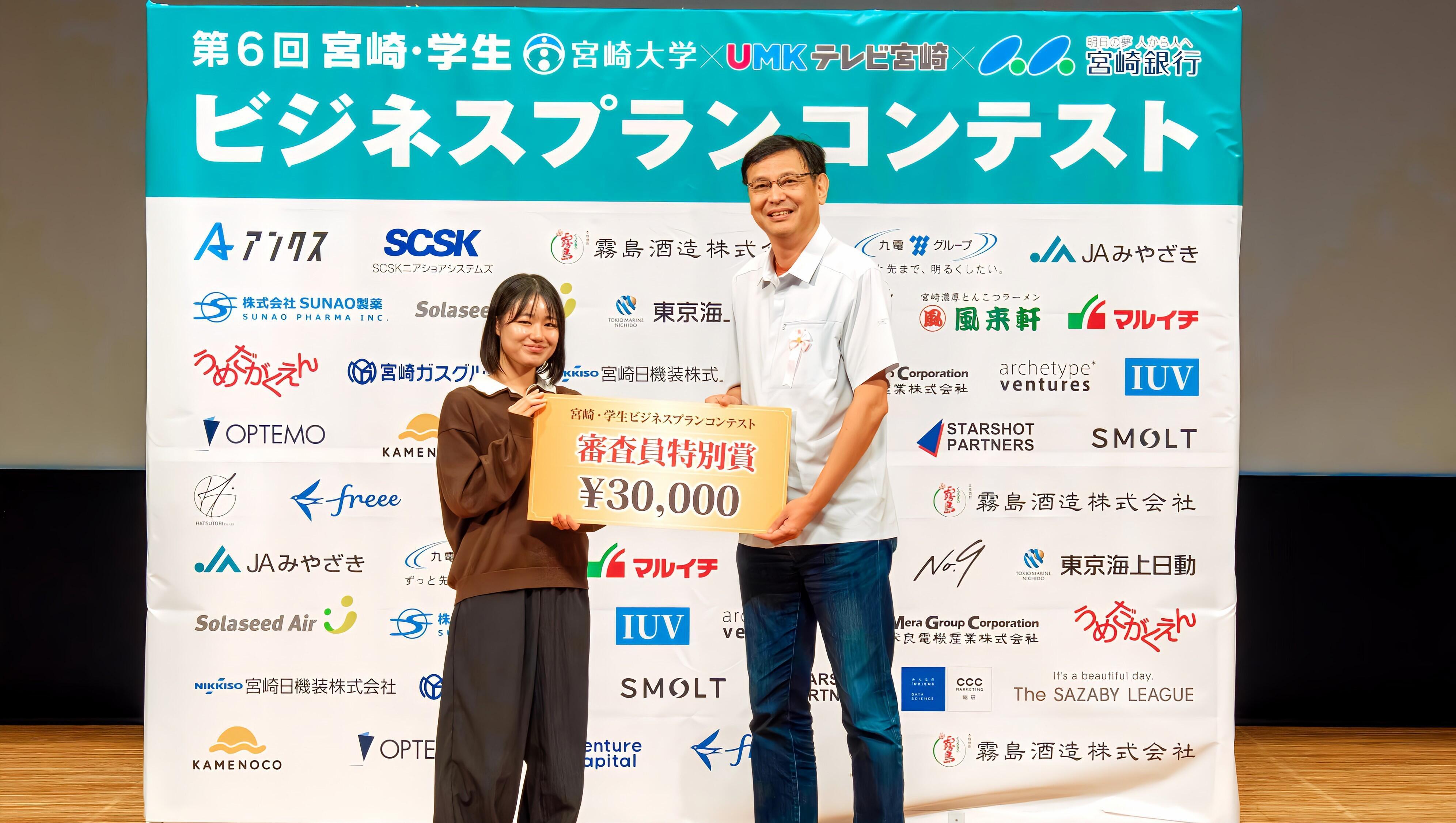 2025年10月4日開催の第6回「みやざきビジネスプランコンテスト」で、本学1年・安藤百香さん(Omusubi)がYou&UMK賞、3年・西府美羽さん(SHIGAN〈視眼〉)が審査員特別賞およびSCSKニアショアシステムズ株式会社賞を受賞しました。