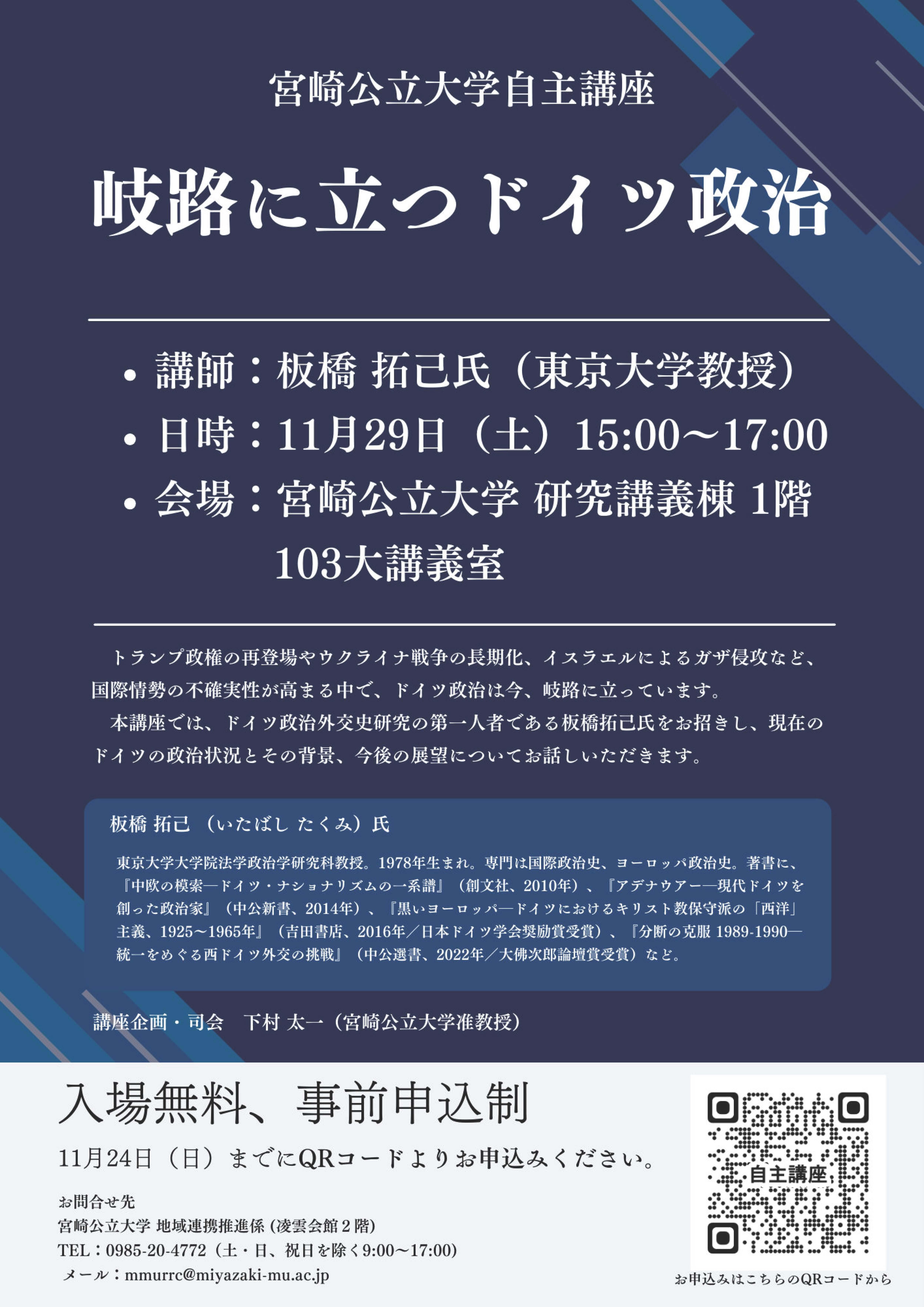 宮崎公立大学では、本学の教員が各専門分野を活かして「自主講座」を行っています。 本講座では、ドイツ政治外交史研究の第一人者である板橋拓己氏をお招きし、現在のドイツの政治状況とその背景、今後の展望についてお話いただきます