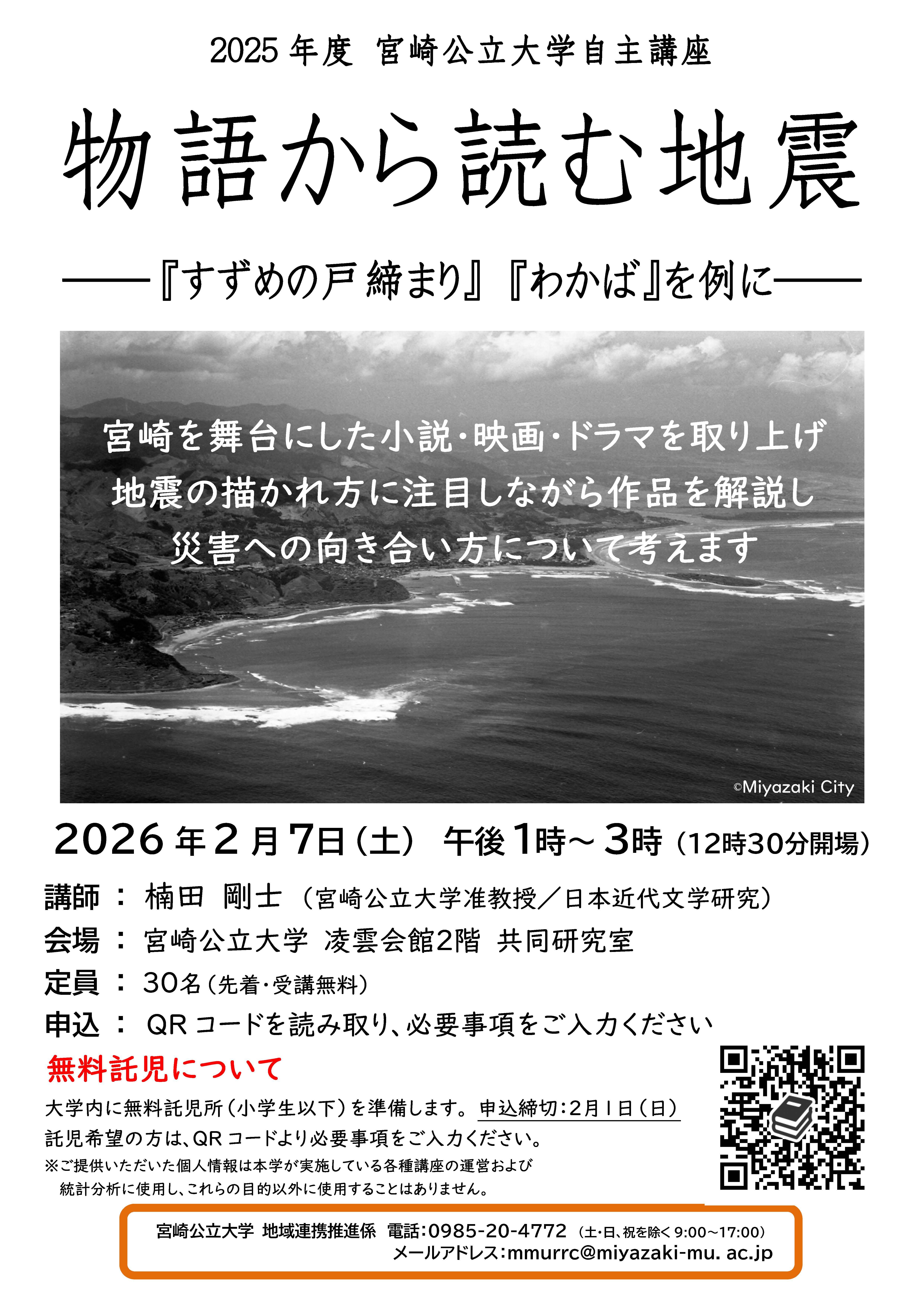 本講座は、宮崎を舞台にした小説・映画・ドラマを取り上げ、地震の描かれ方に注目しながら作品を解説し、災害への向き合い方について考えます。