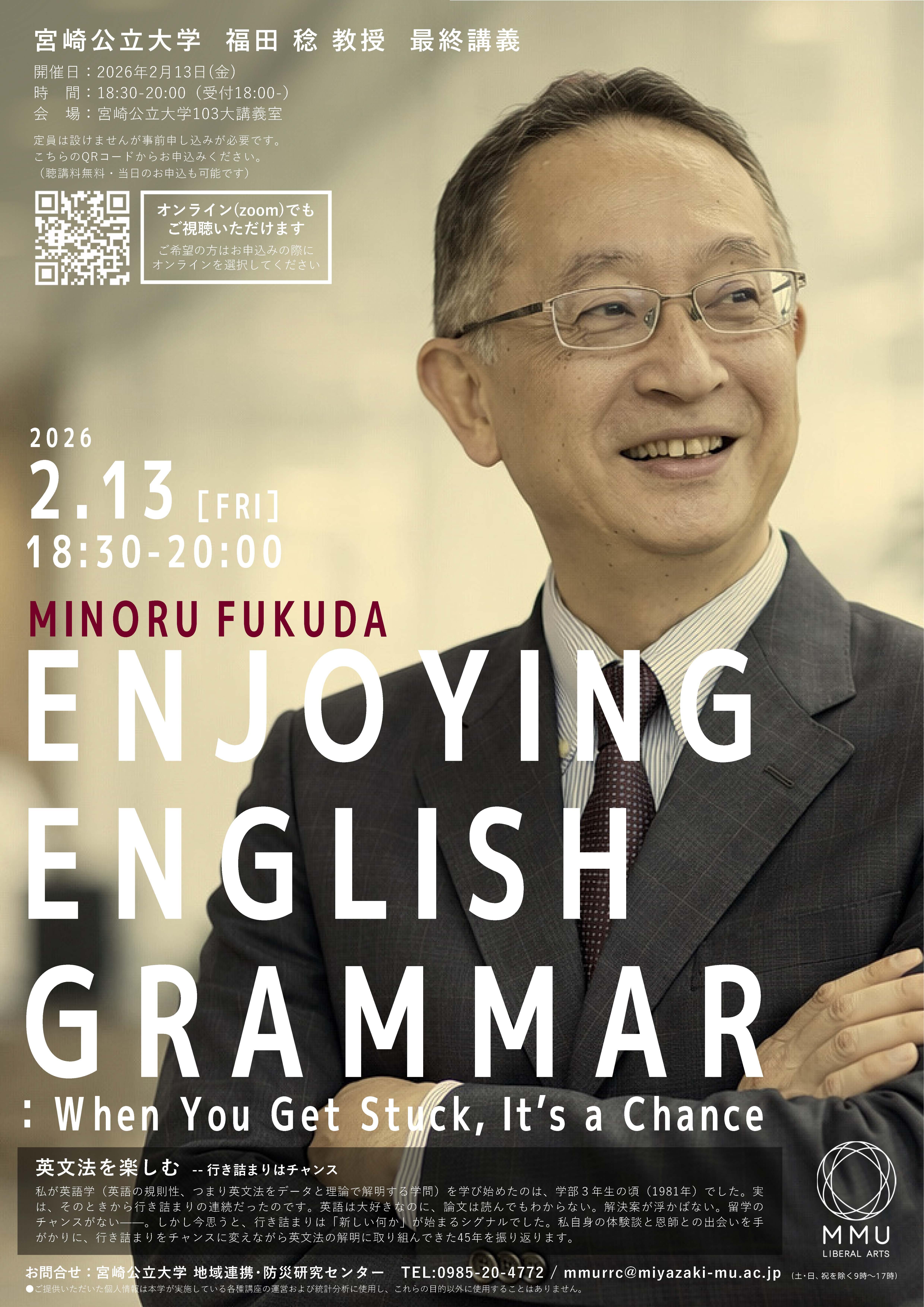 令和7年度をもって本学を退職される福田 稔 教授の最終講義を下記のとおり開催いたします。 受講をご希望の方は、下記の概要及びフライヤーをご覧の上、申込方法に従いお申込みください。