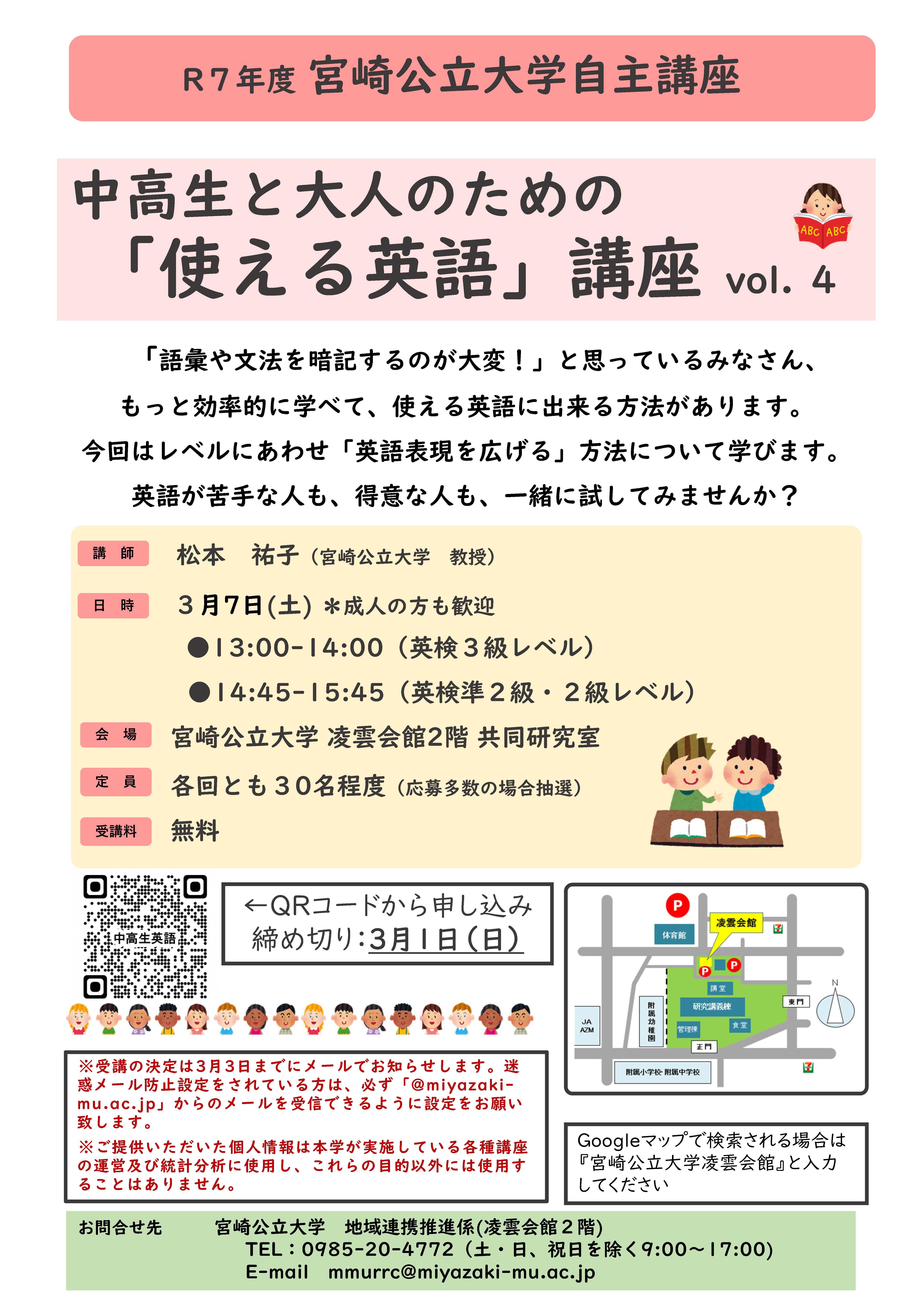 ■ 講 師 松本 祐子 (宮崎公立大学 教授) ■ 日 時 3月7日(土) ○英検3級レベル 13時00分~14時00分 ○英検準2級・2級レベル 14時45分~15時45分 ■ 場 所 宮崎公立大学 凌雲会館2階 共同研究室 ■ 定員・対象者 各回とも30名程度、事前申し込み(応募多数の場合抽選) 中学生以上の方であれば年齢などに制限はございません。どなたでもお気軽にご参加いただけます(下記「お申込みについて」よりお申し込みください)。 ※応募多数の場合は抽選となります。(受講の案合(可否等)は3月3日までにメールでお知らせします。) ■ 受講料 無料 ■ お申込みについて(3月1日(日)締切り) 〉お申込みはこちら 〉チラシデータはこちら